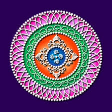 This is a small, simple yet extremely vibrant design. In addition to the ornate colors used, the colorful pattern of the diyas adds a definite charisma to this rangoli.